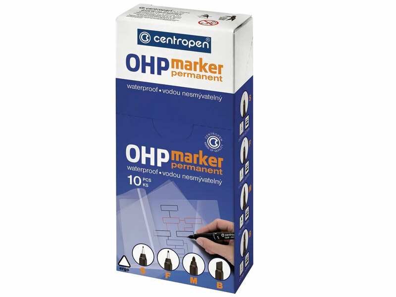 Permanentný popisovač s okrúhlym hrotom určený nielen na popisovanie transparentných fólií do spätných projektorov, ale tiež na plastické hmoty, sklo a pod.