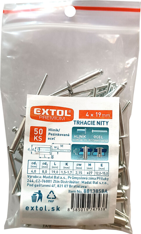 Chcete doručit zboží do Česka? Prohlédněte si Extol Premium trhacie nity hliníkové 4,0x19mm 50ks, 8813858A