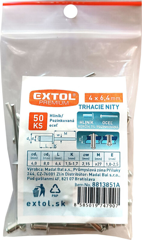 Chcete doručit zboží do Česka? Prohlédněte si Extol Premium trhacie nity hliníkové 4,0x6,4mm 50ks, 8813851A