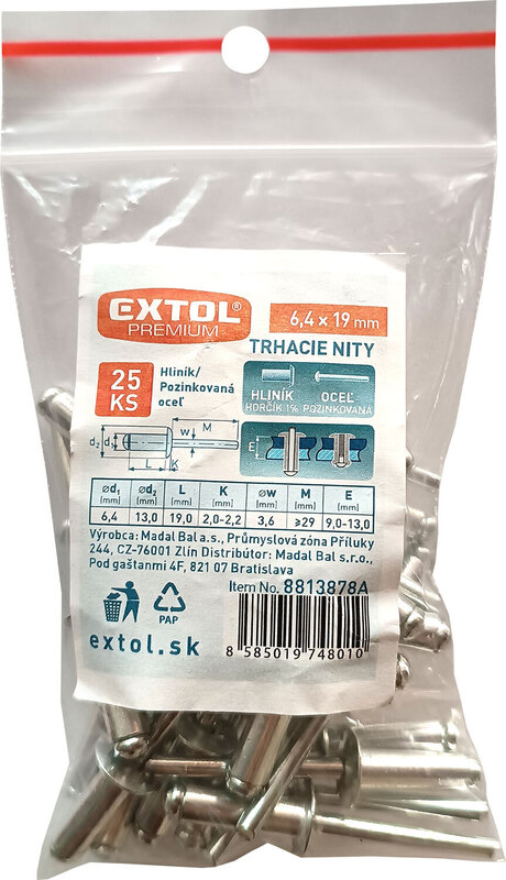 Chcete doručit zboží do Česka? Prohlédněte si Extol Premium trhacie nity hliníkové 6,4x19mm 25ks, 8813878A