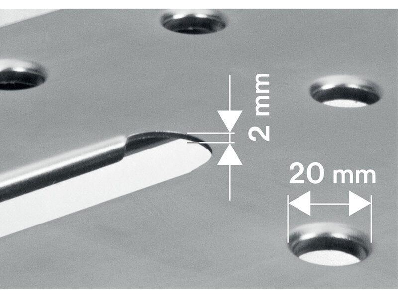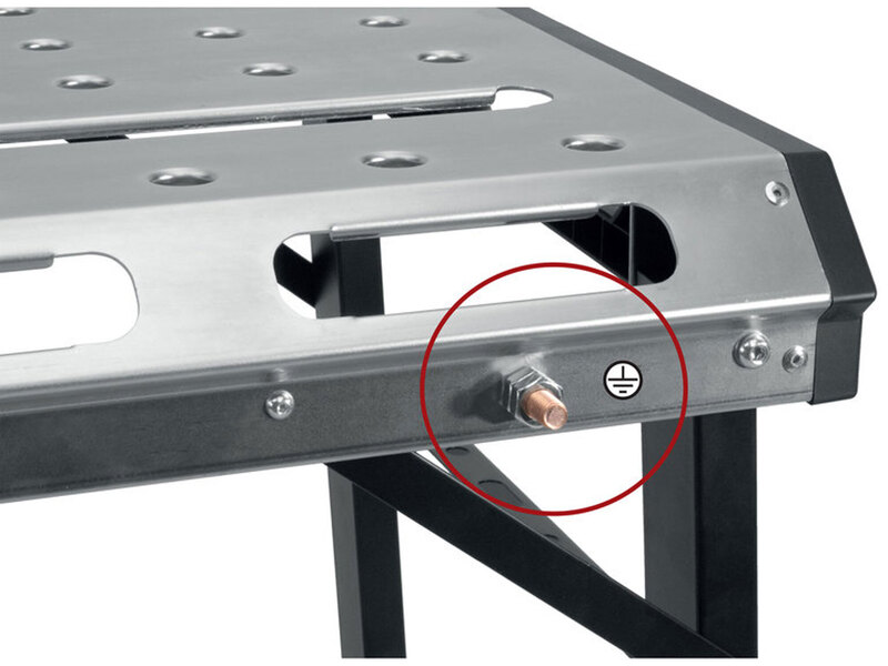 Prenosný zvárací stôl s výškovým nastavením pracovnej plochy s rozmermi 107x53cm a max. nosnosťou 454kg je vyrobený z 2mm hrubého galvanizovaného oceľového plechu s množstvom manipulačných výrezov a otvorov s priemerom 20mm pre vymedzovacie a oporné zarážky a upínacie svorky.