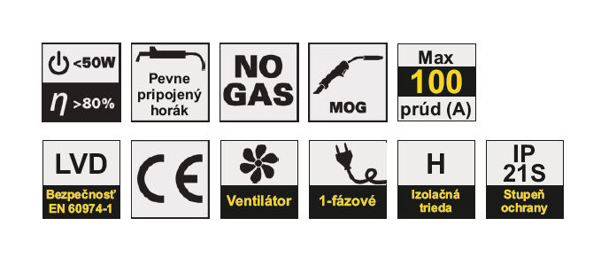 Vrátane príslušenstva: MIG horák (pevne pripojený), zemniaca svorka, zvárací štít, cievka s plneným drôtom Ø 0,9 mm / 0,1 kg, krabica.