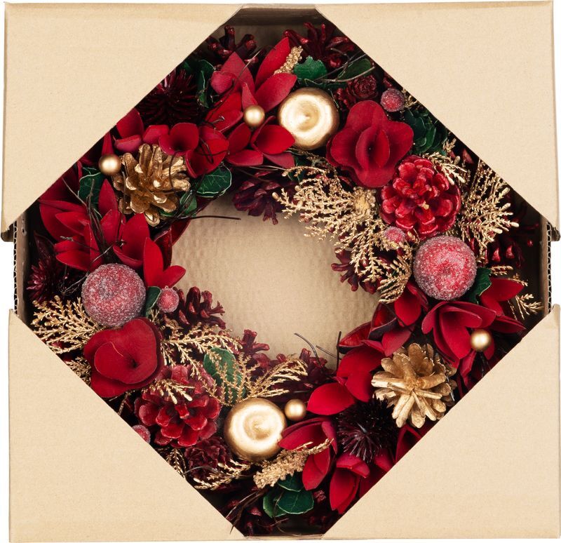 Vianočný veniec MagicHome v červeno-zlatej farebnej kombinácii je krásnou a štýlovou dekoráciou, ktorá vnesie do vášho domova pravú sviatočnú atmosféru. Je ozdobený detailne prepracovanými prvkami – šiškami, guličkami, kvetmi a trblietavými ozdobami v luxusnom červeno-zlatom prevedení.