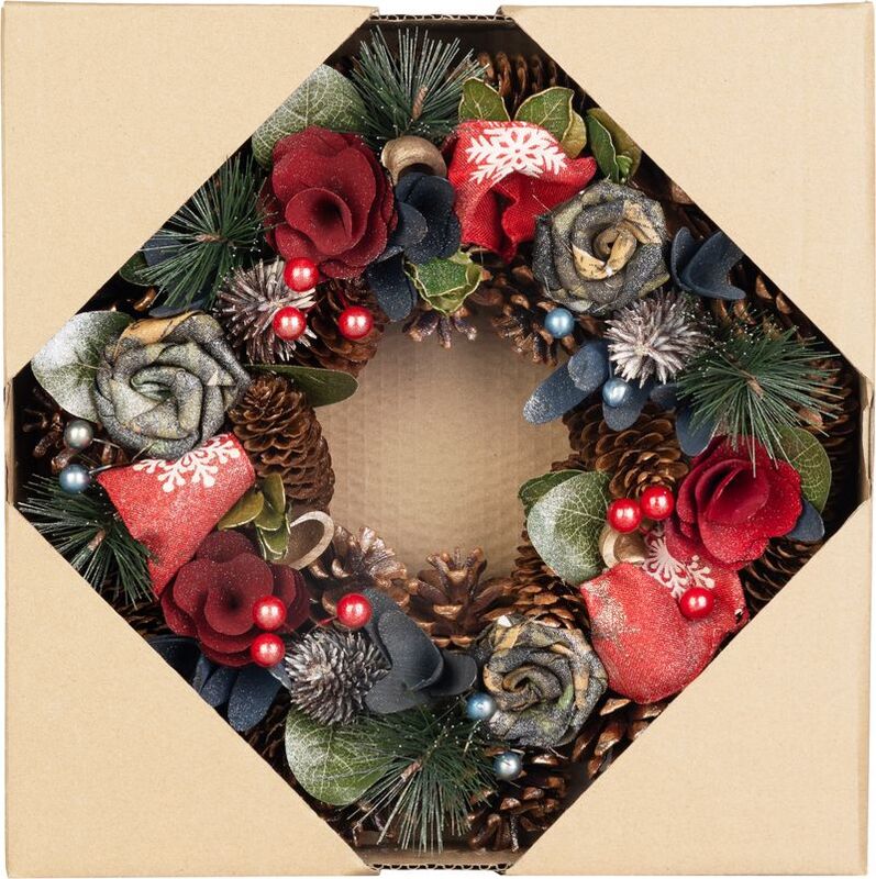 Dizajnový vianočný veniec MagicHome prinesie do vášho domova nádych elegancie a sviatočnej atmosféry. Veniec je zdobený prírodnými šiškami, dekoratívnymi kvetmi a ozdobnými guľôčkami v modro-červených tónoch, ktoré vytvárajú moderný a pritom teplý vzhľad.