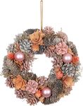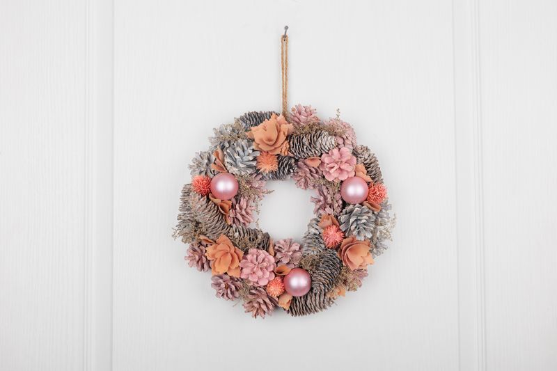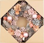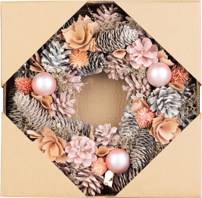 Dizajnový vianočný veniec MagicHome prinesie do vášho domova nádych elegancie a sviatočnej atmosféry. Veniec je zdobený prírodnými šiškami, dekoratívnymi kvetmi a ozdobnými guľôčkami v ružovo-oranžových tónoch, ktoré vytvárajú moderný a pritom teplý vzhľad.