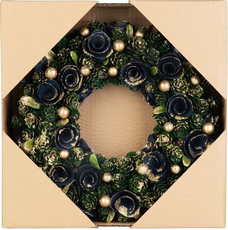 Dizajnový vianočný veniec MagicHome prinesie do vášho domova nádych elegancie a sviatočnej atmosféry. Veniec je zdobený prírodnými šiškami, dekoratívnymi kvetmi a ozdobnými guľôčkami v zeleno-modro-zlatých tónoch, ktoré vytvárajú moderný a pritom teplý vzhľad.